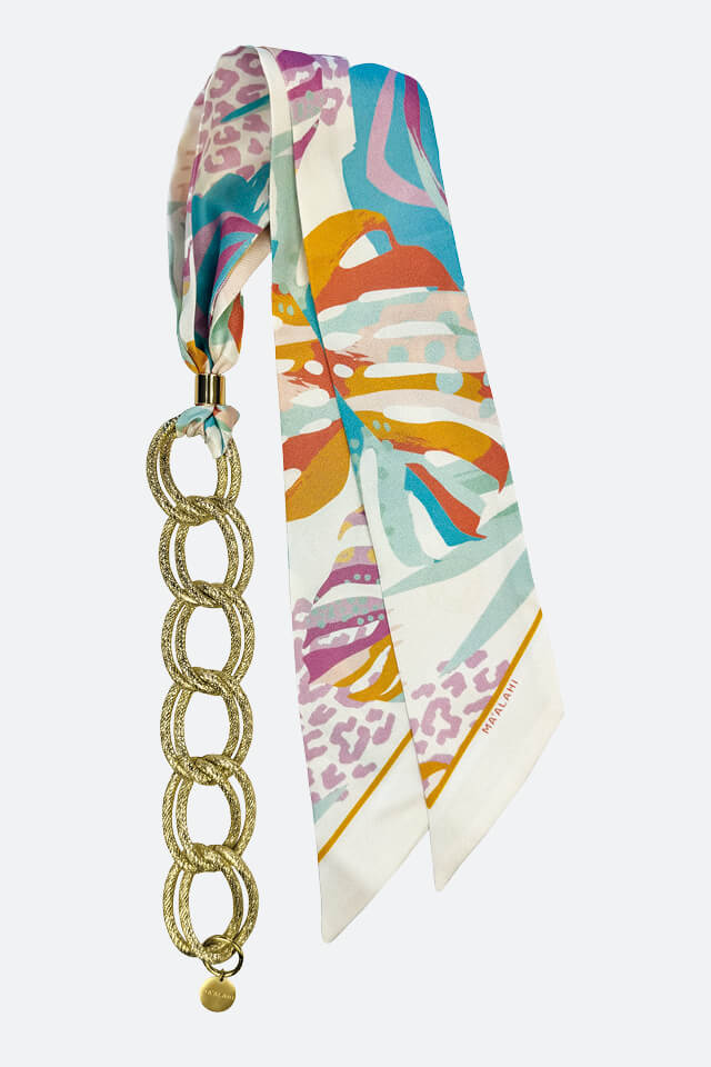 Dieses einzigartige Accessoire vereint Eleganz mit Flexibilität: Trage es als edles Armband oder als stilvolle Halskette. Die Kette aus eloxiertem Aluminium sorgt für ein angenehm leichtes Tragegefühl, während das hochwertige Seidenband aus 100 % Silk Twill im Design „Waikiki“ kunstvoll eingeflochten ist. Das Band kann individuell ausgetauscht werden, um Deinem Look eine persönliche Note zu verleihen.